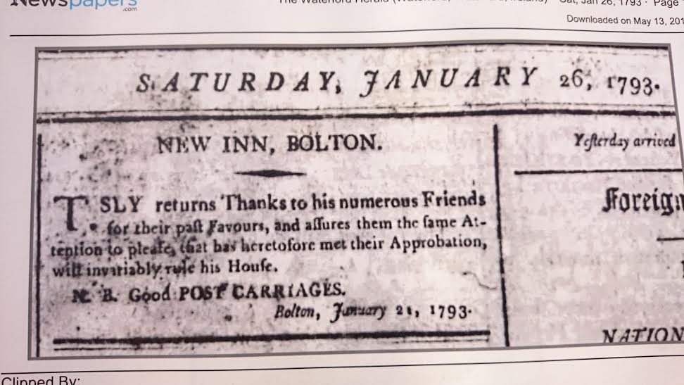 Daisybank opened as a Coaching Inn in 1793, serving the mail packet station at Cheekpoint which originated with the local landlord Cornelius Bolton.  We know the date as the hotelier, J. Sly advertised his new Inn in the Waterford Herald. The advertisement is dated as January 21st 1793  By calling it a new Inn, I think it safe to assume that the old inn is what we now know as McAlpins, Suir Inn.