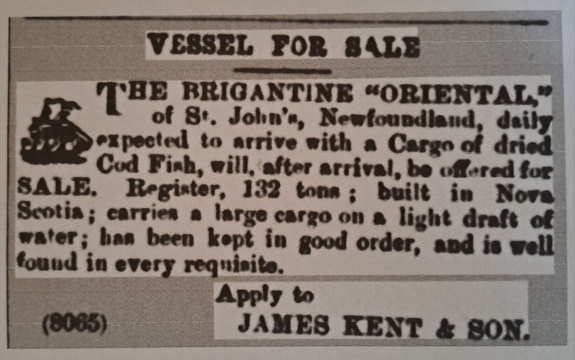 Very interesting piece of history. Many years ago a fellow trainee nurse in London with my wife was Anne Spencer from Waterford! As for the Oriental, she was built at Tatamagouche, Nova Scotia in 1857, and owned first by Walter Grieve and then Philip Cleary in St Johns Newfoundland before transfer to Geoffrey Spencer and disappears from the Mercantile Navy List after 1888. At that time the brigantine was becoming unusual and most vessels had been re-rigged as schooners. or even as ketches.