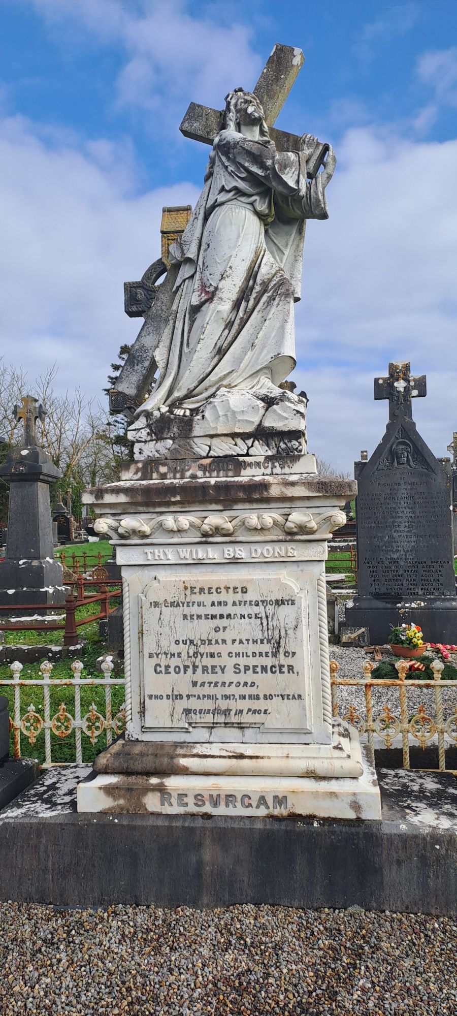 Geoffrey Spencer died in April 1917 and is interred in Ballygunner graveyard. His first wife, Catherine who died in 1877, is interred to his left, his second wife Mary, is to his right; she died in July 1899. Many of their children are mentioned too. Geoffrey and Catherine had five or possibly six children, he and Mary had ten.