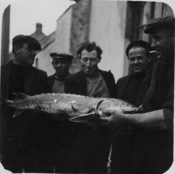 Sturgeon on display at Passage East 1962. The fish was caught by John Baldwins boat the MFV Silver Crest. Photo includes Elaine Heffernan, Collette Hutchinson, Sean Twomey Gerald Baldwin, Desmond Baldwin, Gerald Condon and Helena Heffernan. Image courtesy of Tom Baldwin.