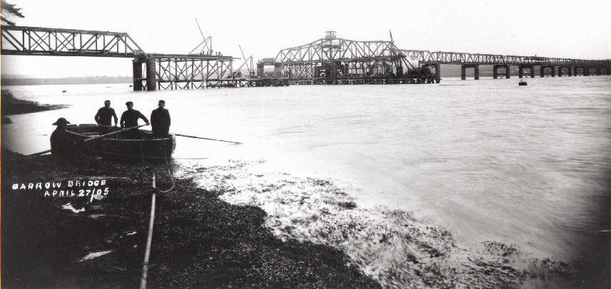As it happens, one of the biggest issues was unforeseen in the tendering process.  The twin pillars onto which the spans were placed had to be laid on a foundation of the river bedrock.  However, as they proceeded out into the Barrow the depths got ever deeper and in some cases the workers had to dig to 108 feet below the mean water level. Such extra work added a cost of £12,000 to the bridge.