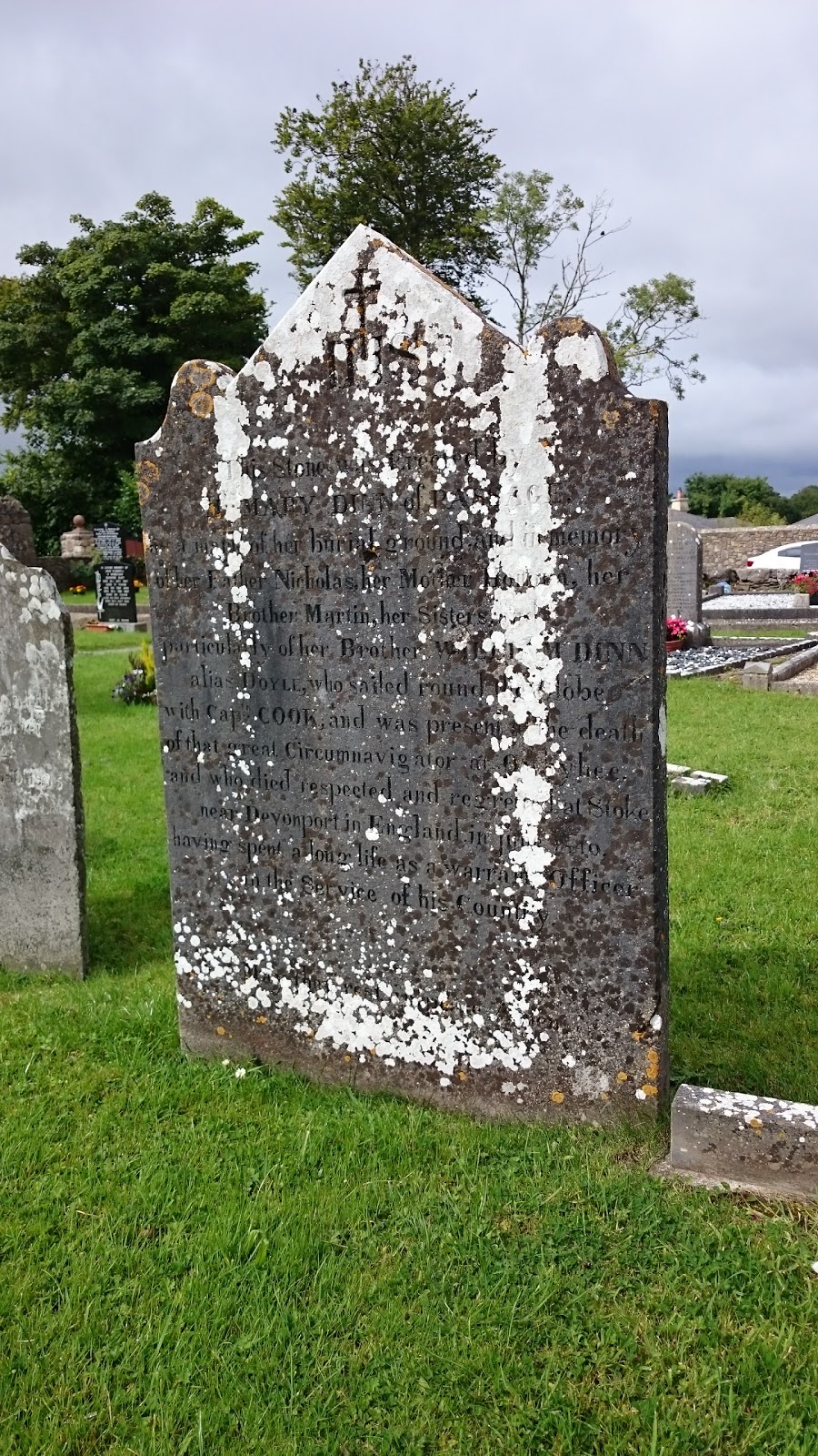 The actual stone (pictured above) records that; This stone was erected by | MARY DINN of Passage | as a mark of her burial ground and in memory | of her father NICHOLAS, her mother HONORA, her | brother MARTIN, her sisters and | particularly of her brother WILLIAM DINN | alias DOYLE, who sailed round the Globe | with Captr COOK, and was present at the death | of that great circumnavigator at Owhyhee. | and who died respected and regretted at Stoke | near Devonport in England, in June 1840 |having spent a long life as a Warrant Officer | in the Services of his Country. | “May they Rest in Peace. Amen”.