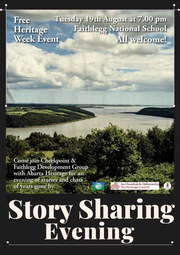Meanwhile the local Development group in Cheekpoint will deliver a story sharing evening over the week which we will fully support. All are welcome to come along to Faithlegg National School for an evening of chat and sharing stories about the area in years gone by. The event will take place on Tuesday 19th August at 7 pm and is being organised by Cheekpoint & Faithlegg Development Group and Abarta Heritage. Not all stories are captured in ink and on paper. Each community and townland in Ireland is a treasure-trove of stories, histories and folklore held in memory and passed down through the generations. Some stories will be half remembered tales told by grandparents, strange things heard as children, nicknames for different areas or features in the landscape, childhood games and so on, but they’re all valuable and we would love to hear more about them.Abarta Heritage will also be discussing their work on a Heritage Action Plan for the area.
