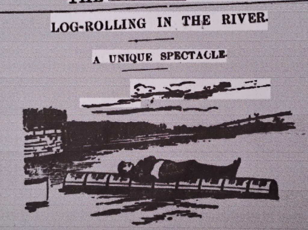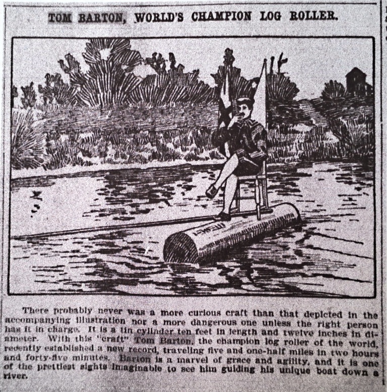 His name was Tom Barton, travelling the country exhibiting a very unique commercial activity. Some say he was from Putney, London, others that he had Irish blood while others said he was a Canadian lumberjack. It’s likely all are true. Tom however, had one unique talent – he was a log roller…a man who balanced on logs in Canadian rivers as they were steered into sawmills.