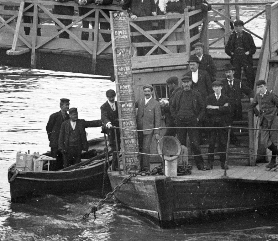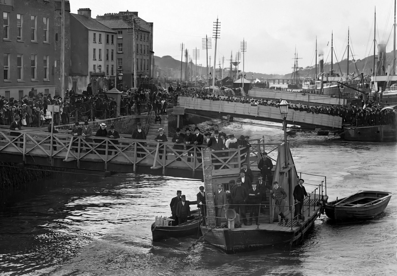 A crowded quay awaits the performance of Tom Barton with his bovril tin log at the ferry pontoon Waterford. AH Poole Photo. Image courtesy of the National Library of Ireland.