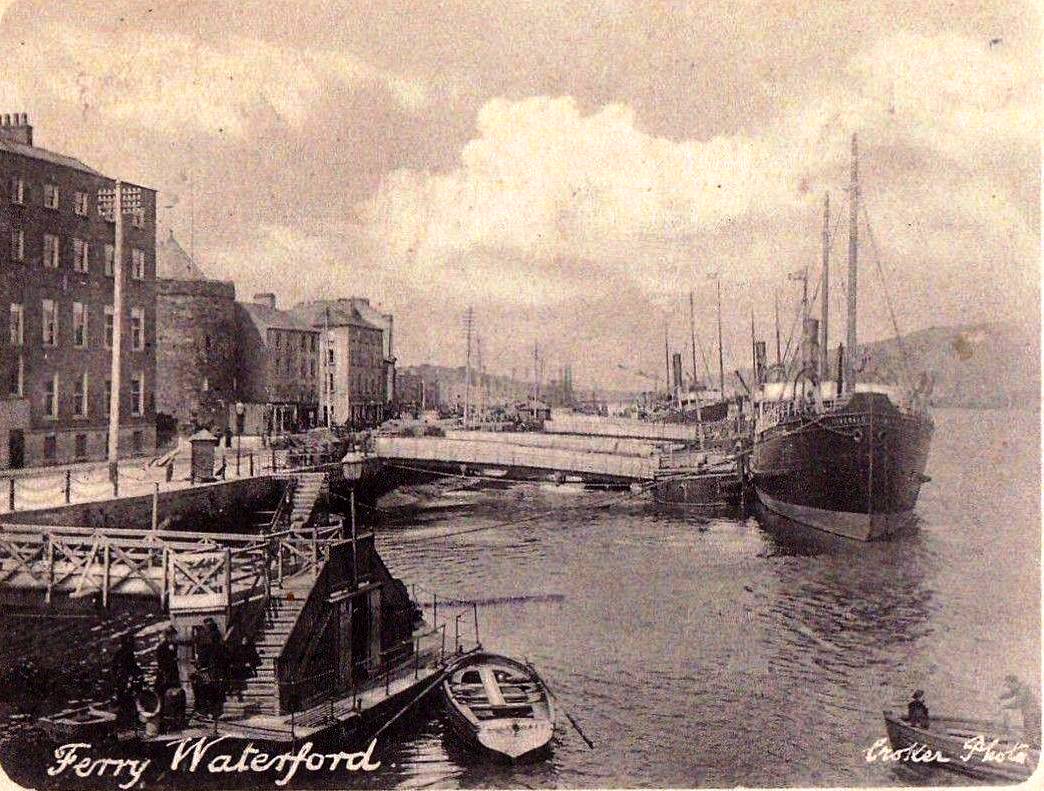 The ferry service of course was ancient. According to Michael O’Neill(3) the rights were granted by King John to Waterford in an original city charter. (In much the same way his father, Henry II, gave the rights at Passage to the Knights Templar. Anyone thinking that this was a new initiative however would I believe be delusional*) It was listed in a letter patent granted by King William III to a certain James Roche on the 13th June 1694. The rent was £4 10s 0d and I’m sure the money was recouped handsomely*! *. In 1786 it seems to have been in the possession of one Cornelius Grogan, when four boats were operating on the service. In the Richards & Scales map of 1764 a ferry slip is shown to the west of conduit Lane*! *. From mid 19th C newspaper clippings it appears that ‘Tower ferry’ was often used to describe it. I would also presume that the ferry’s were carrying livestock as well as human passengers.